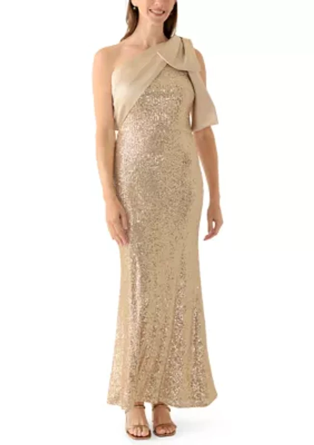Women's Sequin One Shoulder Satin Bow Long Dress