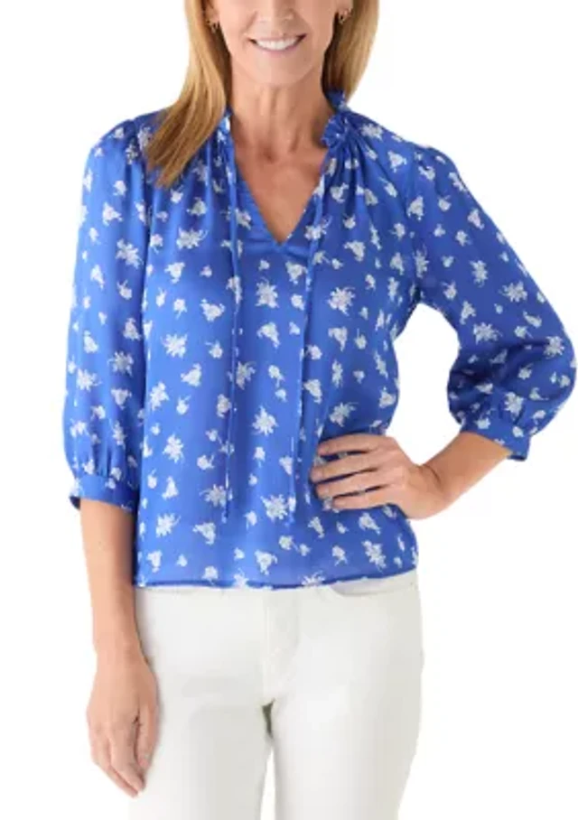 Petite Puff Sleeve Split Neck Floral Peasant Top
