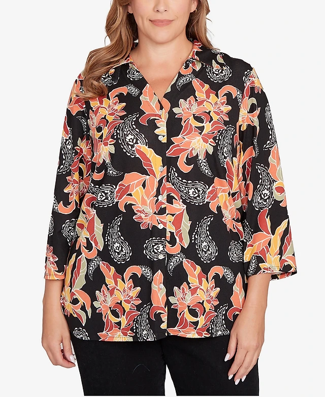 Ruby Rd. Petite Shirt Collar Floral Paisley Button Front Top