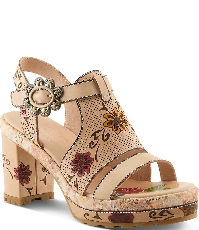 L'ARTISTE Upperbuck Floral Embossed and Perforated Leather Block Heel Sandals