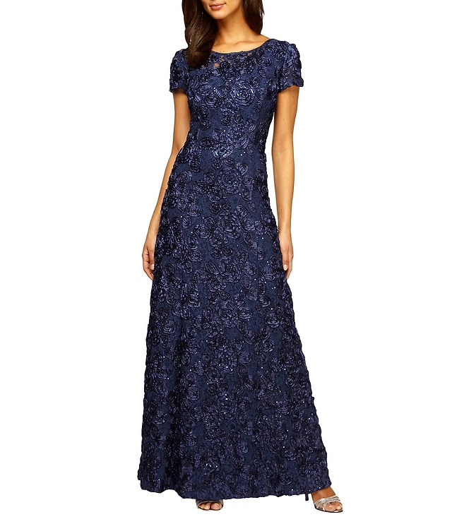 Alex Evenings Jacquard Short Sleeve Off-the-Shoulder Floral Pocketed Gown