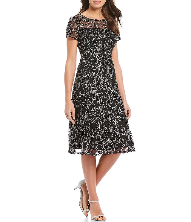Ignite Evenings Embroidered Soutache Floral Lace Illusion Round Neck Short Sleeve Midi Dress