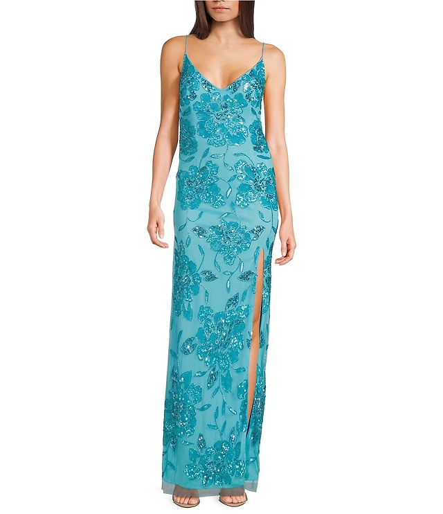 Jump Floral Beaded V-Neck Spaghetti Strap Side Slit Gown