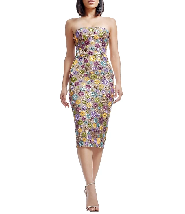 Dress the Population Viviana Sequin Floral Print Strapless Neck Sleeveless Sheath Midi Dress