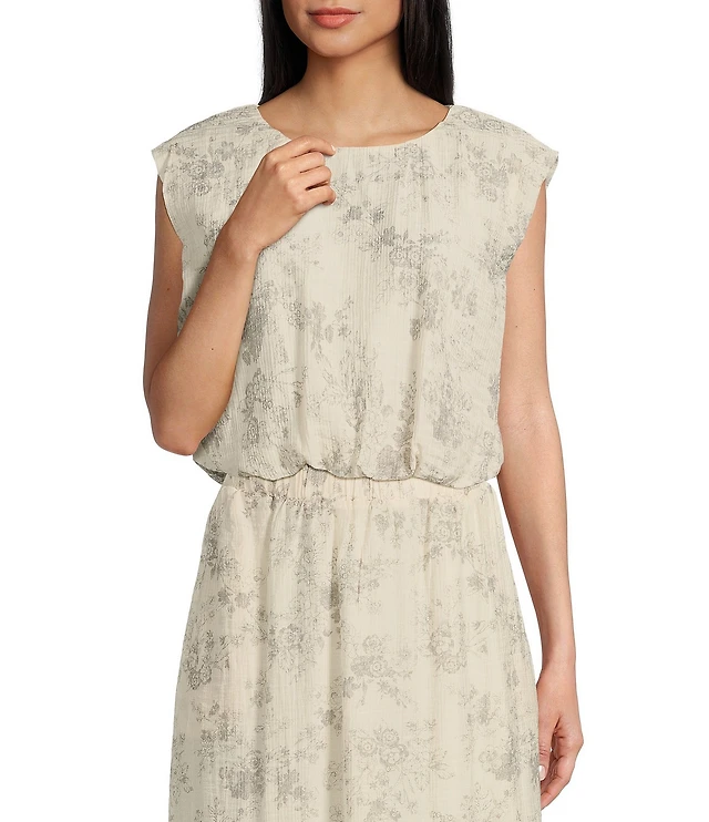 CeCe Plus Woven Floral Print Round Neck Short Puff Sleeve Blouse