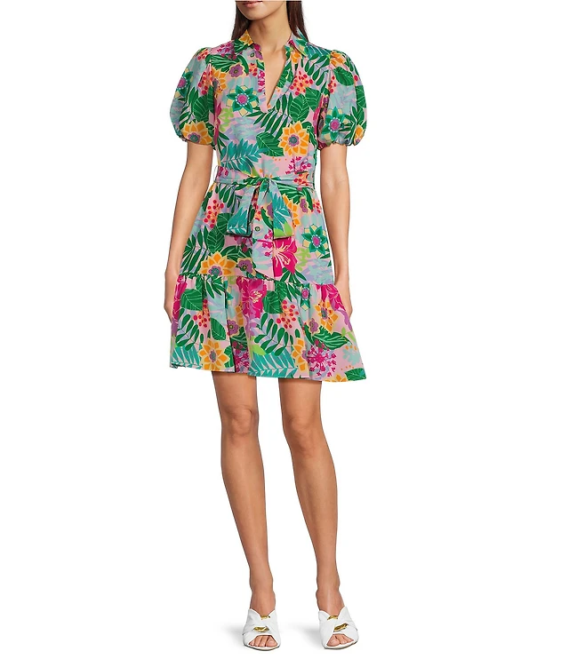 Jessica Howard Tropical Floral Short Balloon Sleeve V-Neck Collar Shirt Dress