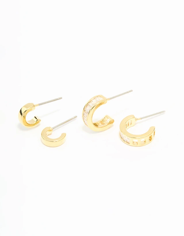 Gold Plated Cubic Zirconia Plain & Baguette Hoop Earrings 2-Pack