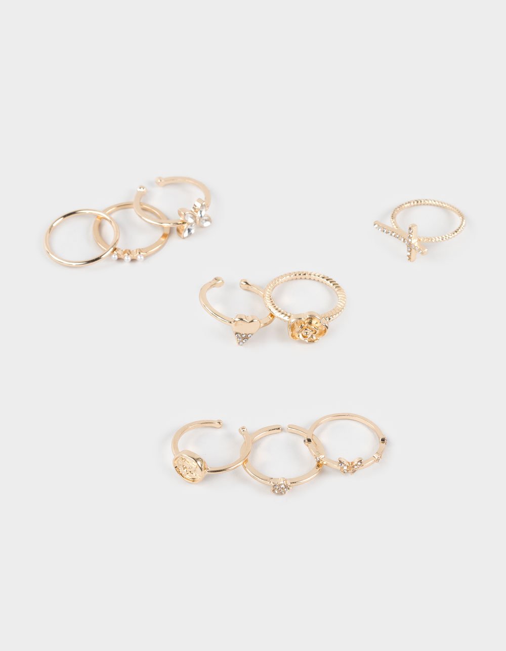 FULL TILT 9 Pack Butterfly/Rose/Pearl Dainty Rings - GOLD