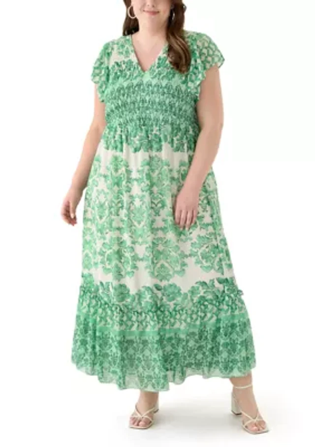 Plus Flutter Sleeve V-Neck Printed Chiffon Maxi Dress