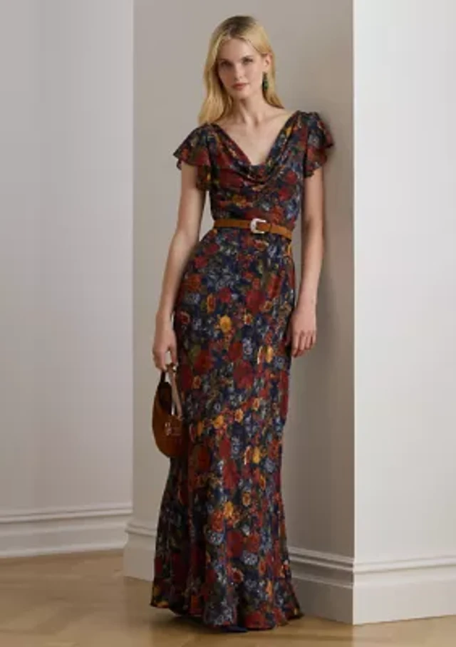 Plus Long Sleeve Scoop Keyhole Floral Dress