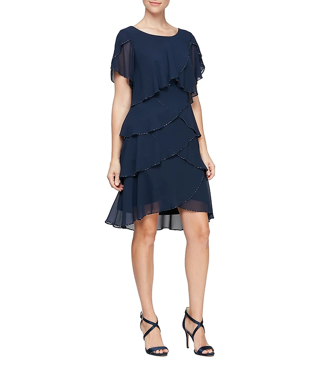 Marina Split 3/4 Sleeve Round Beaded Keyhole Neck Asymmetrical Tiered Chiffon Trapeze Dress