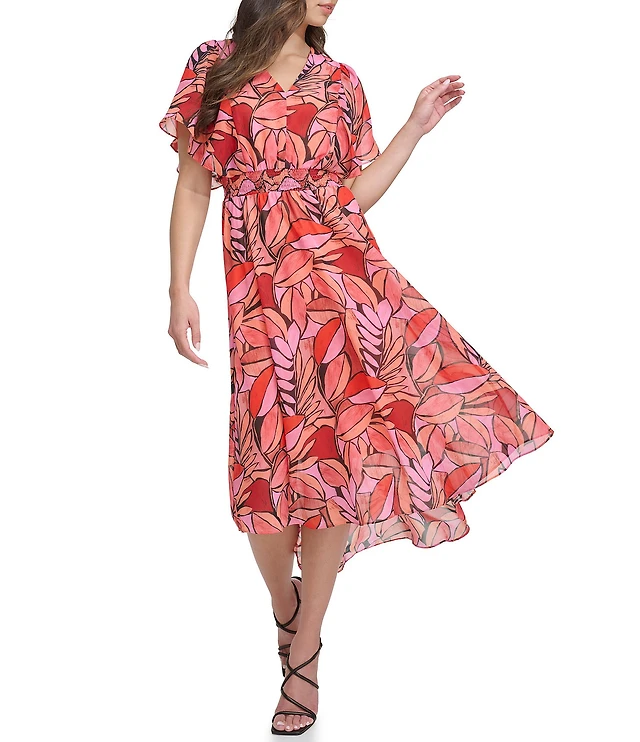 DKNY by Donna Karan Petite Size Short Flutter Sleeve V-Neck Printed Fit and Flare Midi Dress