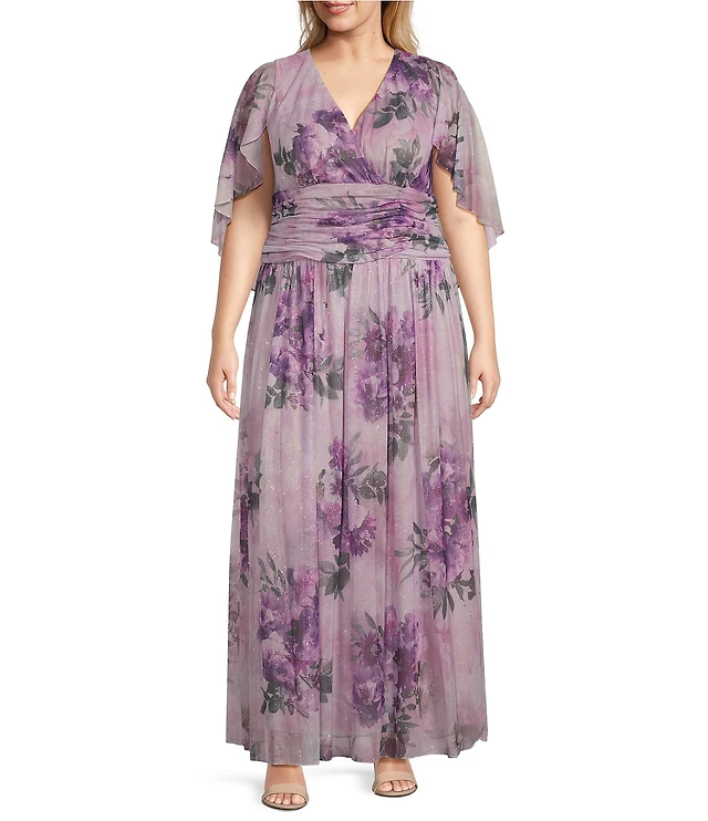 Alex Evenings Plus Size Embellished Short Flutter Sleeve V-Neck Ruched Waist Empire Waist Gown