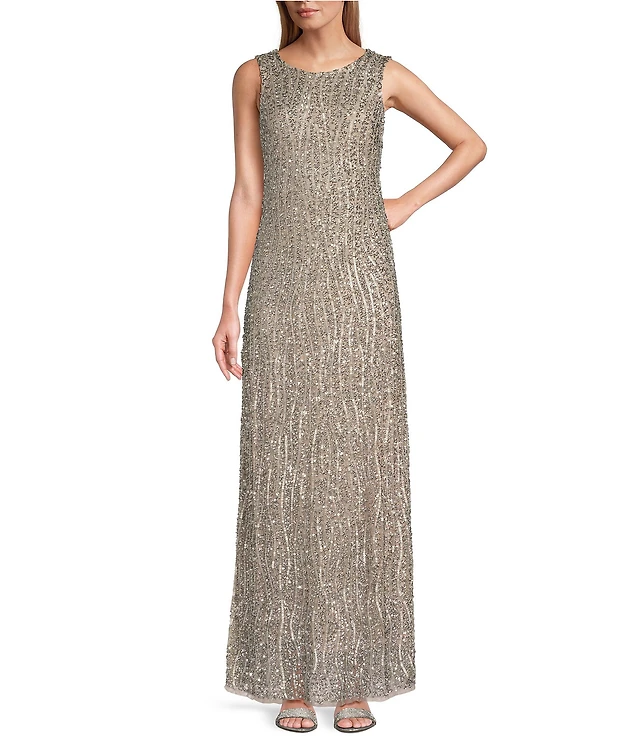 Adrianna Papell Plus Size Illusion Boat Neck Flutter Sleeve Beaded Mesh Blouson Column Dress
