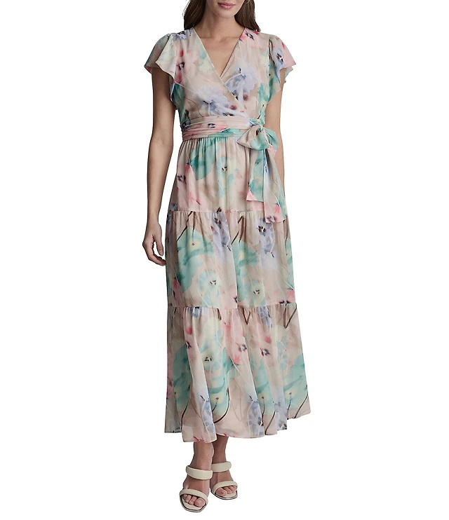 DKNY by Donna Karan Chiffon Floral Tiered V-Neck Short Flutter Sleeve Maxi Dress