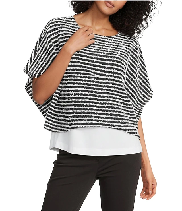 Multiples Yarn-Dyed Boat Neck 3/4 Sleeve Stripe Poncho Top
