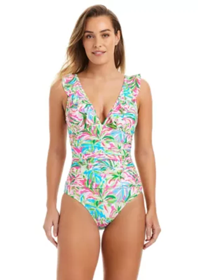 Tommy Bahama Watercolor Floral V-Neck Tiered Ruffle Swim Cover-Up Dress