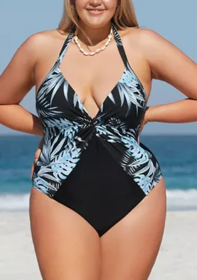 Plus Plunge Palm Printed One Piece Swimsuit