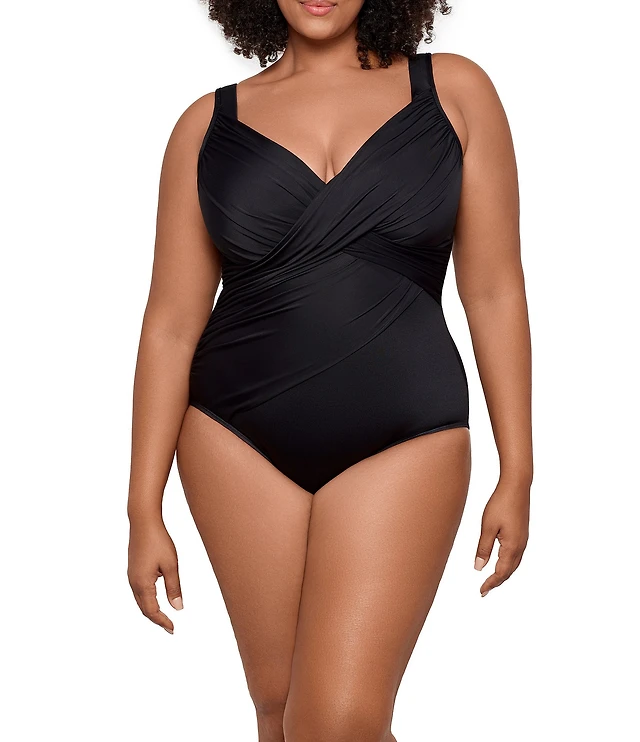 Miraclesuit Plus Size Solid Rock Revele Surplice V-Neck Underwire Bra Tank One Piece Swimsuit