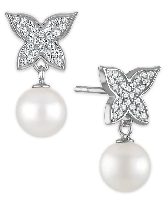 Macy's 2-Pc. Cultured Freshwater Pearl (7-8mm) and Lab Created White Sapphire Earring and Bow Pendant Necklace (0.309 ct. t.w.) Set in Sterling Silver