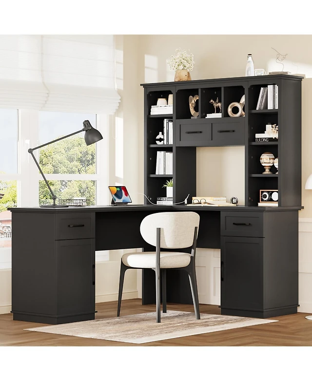 Streamdale Furniture 2-in-1 L-Shaped Desk w/ Cabinets, Drawers, Shelves & Power Outlet - Antique