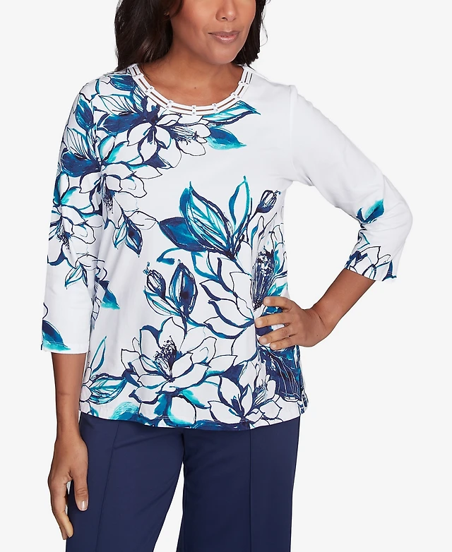 Alfred Dunner Women's Caribbean Blues Monotone Dramatic Floral Tropical Top
