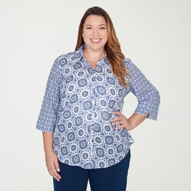 Alfred Dunner Womens Plus Cuffed 3/4 Sleeve Embroidered Button-Down Shirt