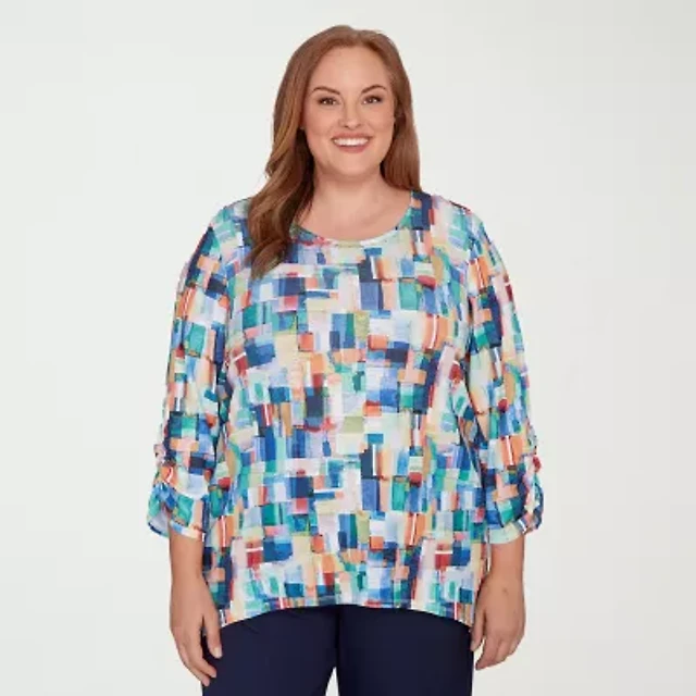 Alfred Dunner Al Fresco Womens Plus Crew Neck 3/4 Sleeve Layered Top