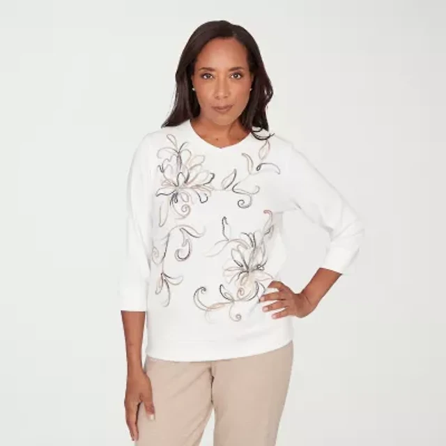 Alfred Dunner Seville Womens Crew Neck Embellished 3/4 Sleeve Floral Pullover Sweater