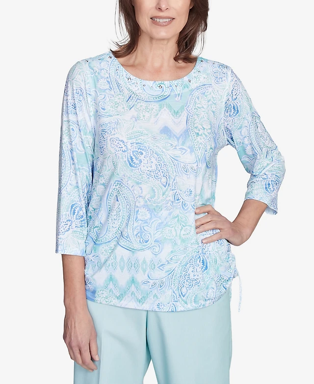 Alfred Dunner Women's St. Thomas Island Mint Paisley Ruched Side Crew Neck Top
