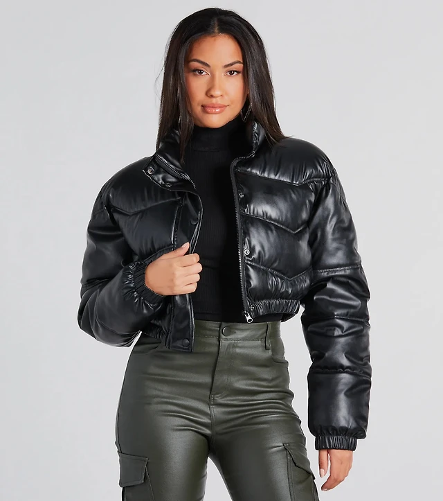 Slick Style Faux Leather Cropped Puffer Jacket