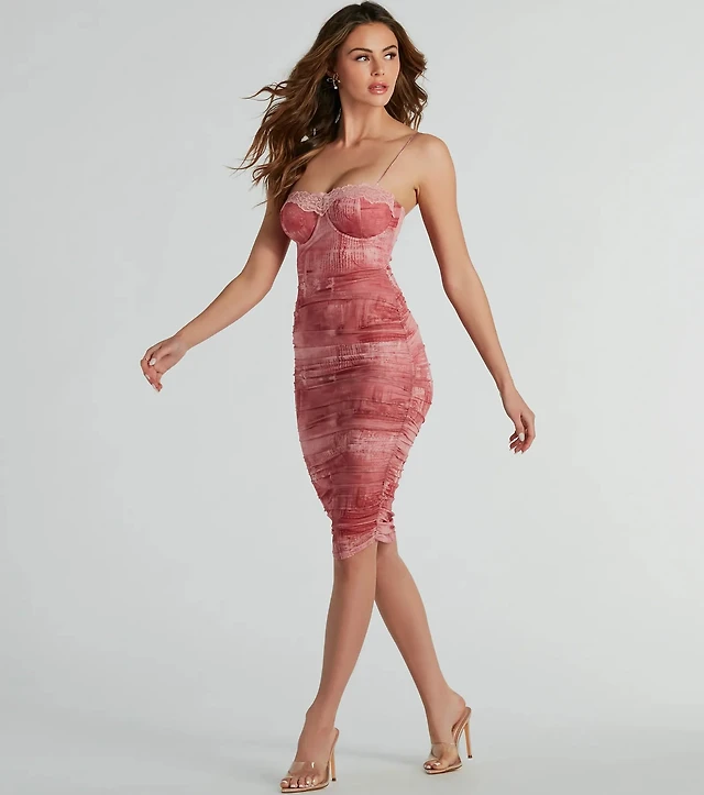 Anne Klein Women's Mesh Floral-Print Ruched-Waist Midi Dress