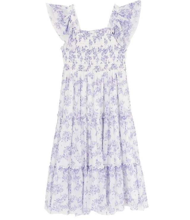 Xtraordinary Little Girls Flutter Sleeve Floral Mixed Media Printed Chiffon Midi Dress