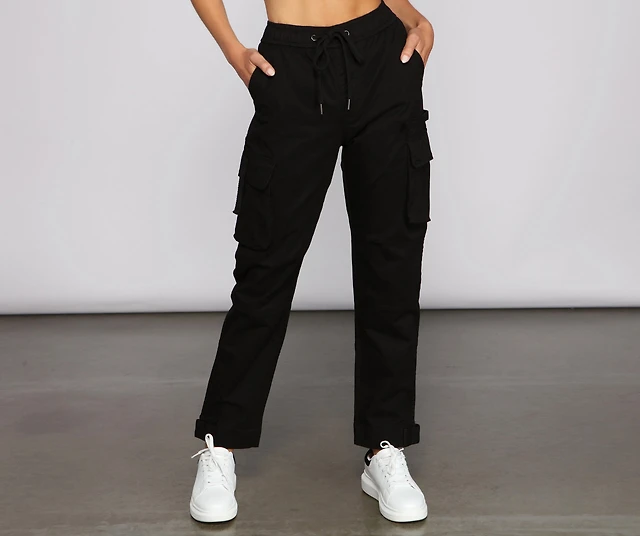 Kinesis Woven Elastic Cinched Cuff Ribbed Waistband Flap Pocket Ankle Joggers