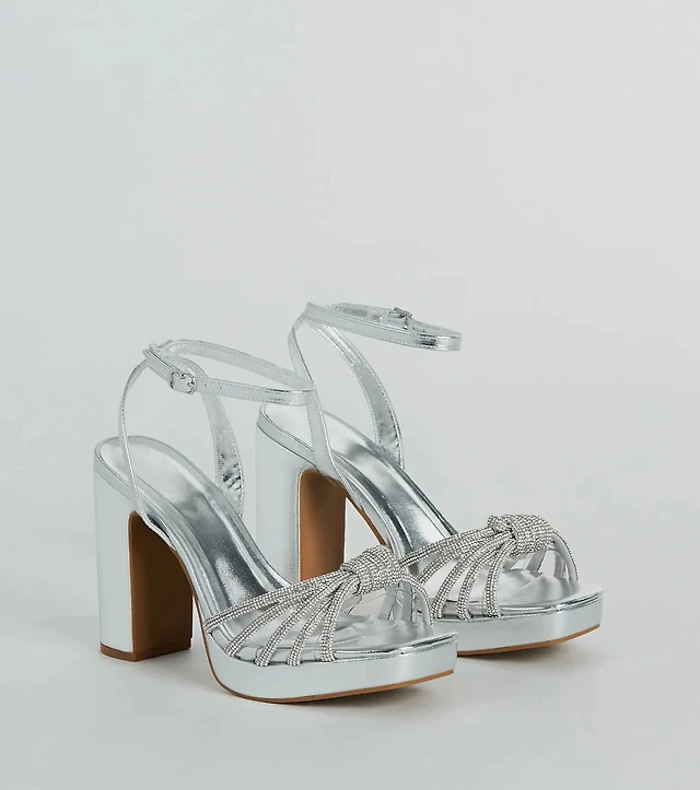 Ready To Party Rhinestone Strappy Metallic Block Heels