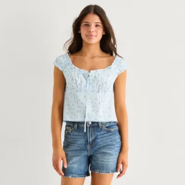 Arizona Womens Juniors Crew Neck Short Sleeve Peasant Top