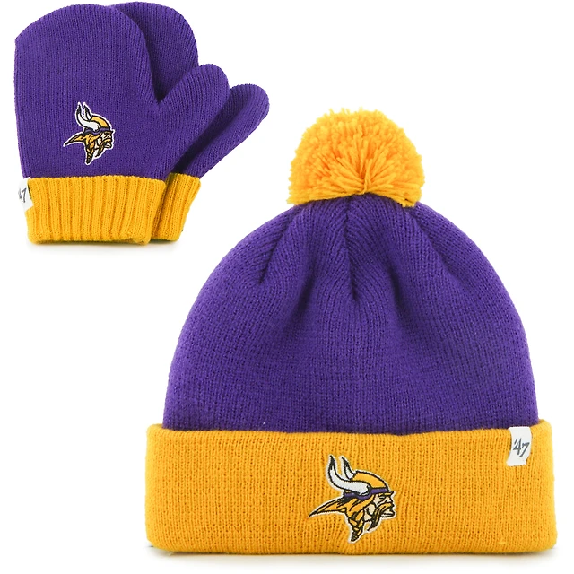 Infant '47 Purple/Gold Minnesota Vikings Bam Bam Cuffed Knit Hat With Pom and Mittens Set
