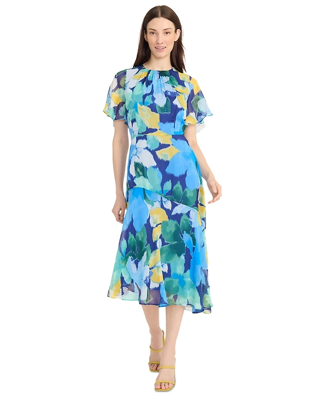Plus 3/4 Sleeve V-Neck Floral Print Chiffon Maxi Dress