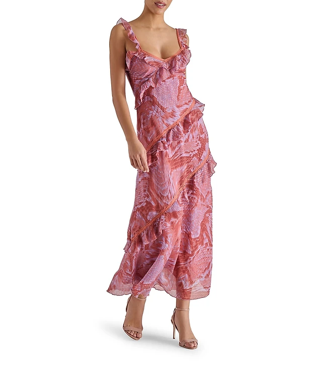 City Vibe Floral Jacquard Square Neck Asymmetric Layered Ruffle Tie Back Dress