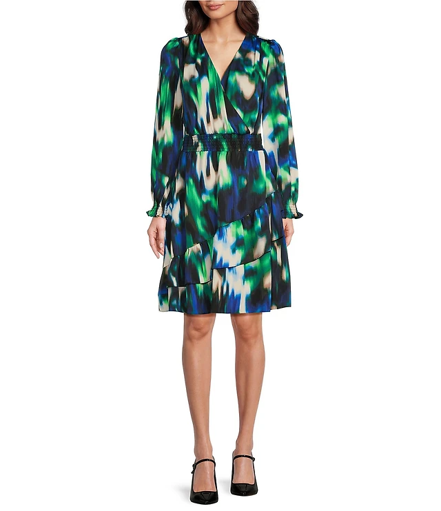 DKNY by Donna Karan Floral Print Charmeuse Ruffle Cap Sleeve Asymmetrical Flutter Hem Faux Wrap Midi Dress