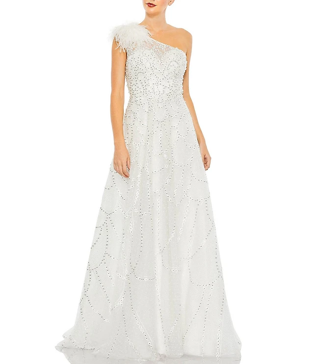 Mac Duggal Embellished Asymmetrical Neck Sleeveless Feather Shoulder A-Line Gown