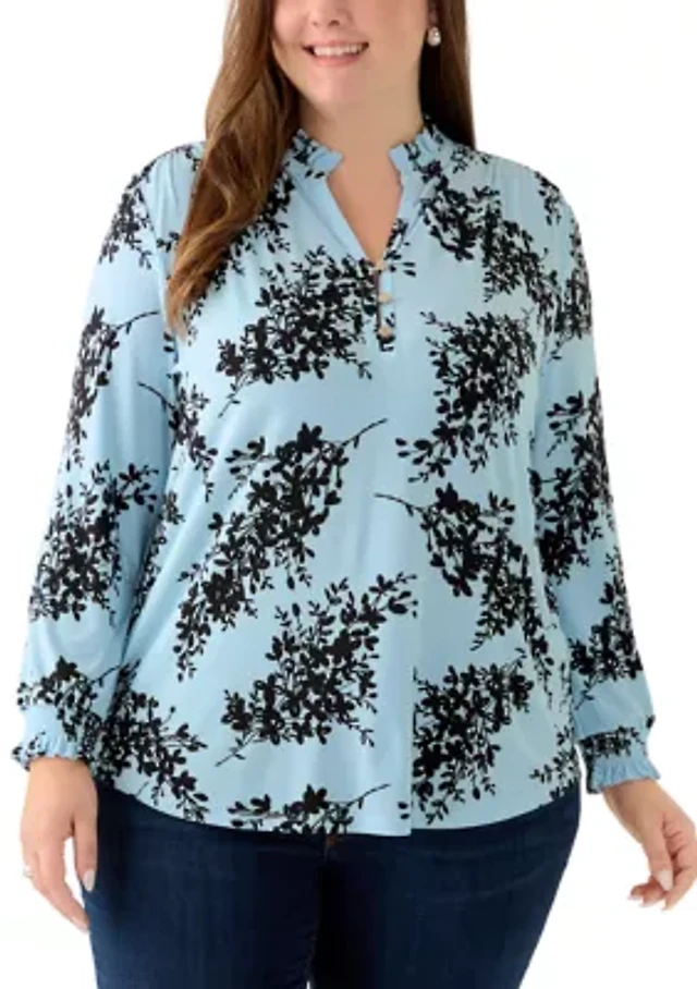 Plus Opal Blue Long Sleeve Ruffle Printed V-Neck with Smocked Cuff