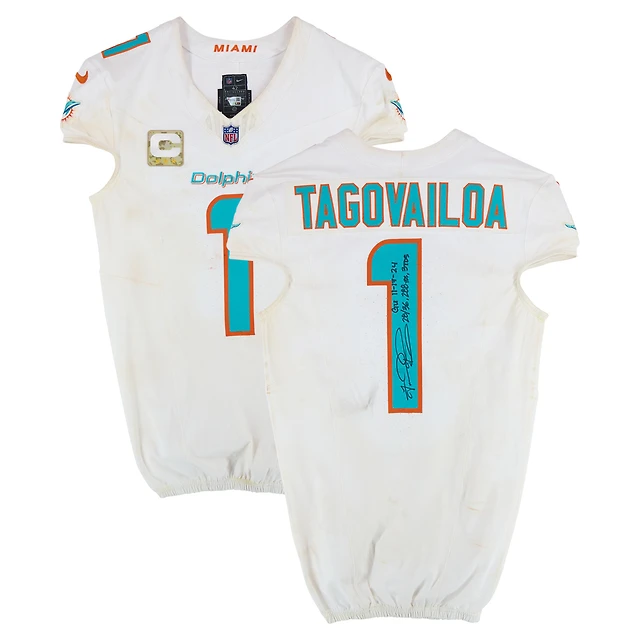 Tua Tagovailoa Miami Dolphins Autographed Game-Used #1 White Nike Jersey vs. Las Vegas Raiders on November 17, 2024 with Multiple Inscriptions