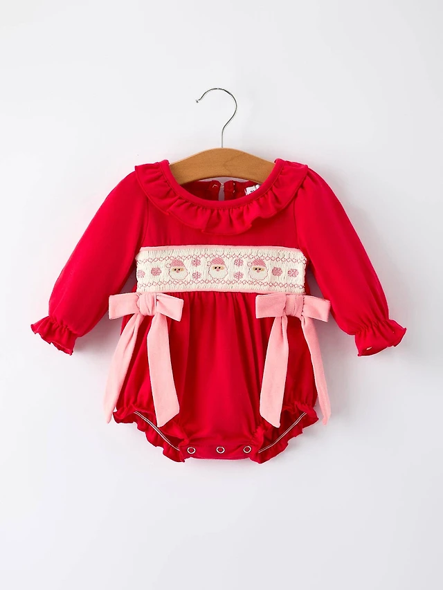 Christmas Smocked Embroidery Baby Girls Romper with Pink Ribbon Ties