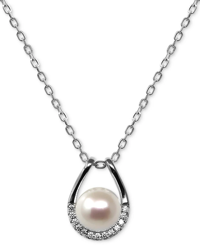 Cultured Freshwater Pearl (8mm) & Diamond Accent Halo 18" Pendant Necklace in Sterling Silver