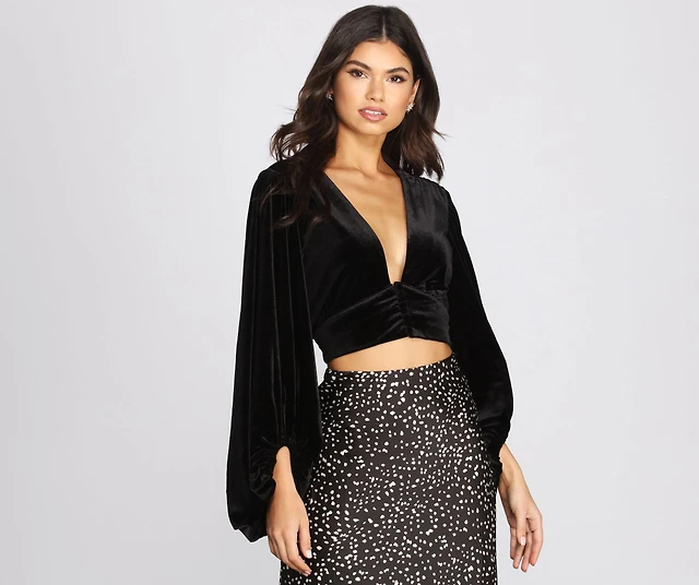 Satin V-Neck Balloon Sleeve Faux Wrap Top