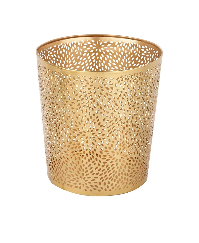 Small, Round, Glam Style Metallic Pierced Metal Waste Basket with Chrysanthemum Pattern