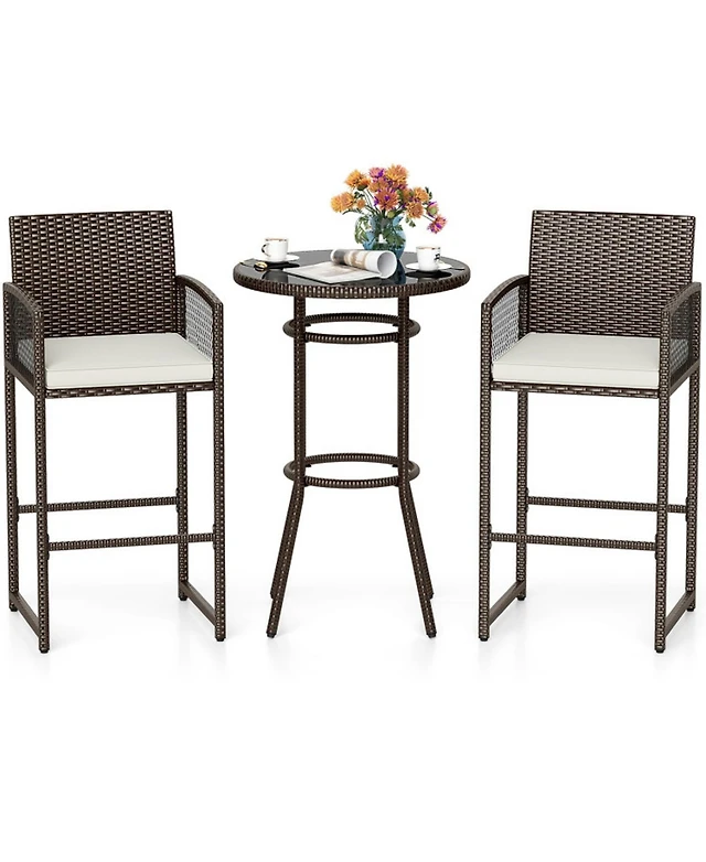 Gouun Pe Wicker 3-Piece Patio Bar Set with Round Tempered Glass Table and Cushioned Armchairs