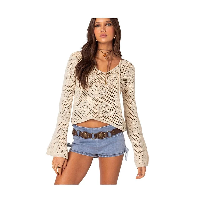 EDIKTED Alora Iridescent Crochet Top - BEIGE