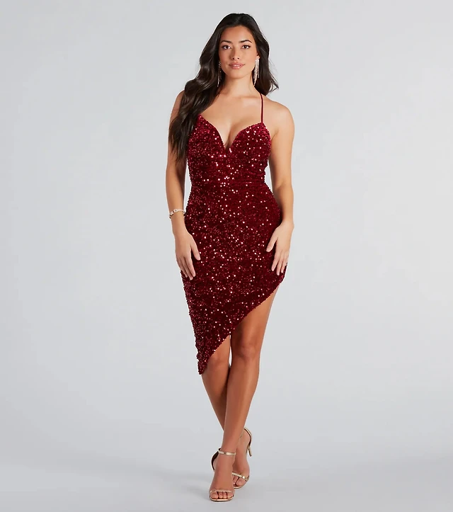 Moda Tara Stretch Velvet Crew Neck Long Sleeve Ruched Asymmetrical Hem Midi Dress